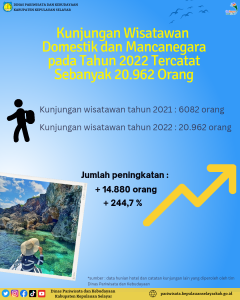 Selayar – Jumlah kunjungan wisatawan ke Kabupaten Kepulauan Selayar pada tahun 2022 meningkat sebanyak 14.880 orang atau meningkat 244,7 persen dari tahun sebelumnya.